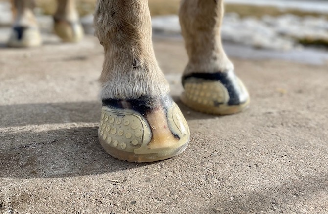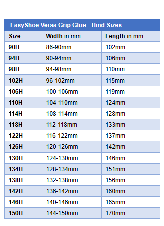 EasyShoe Versa Grip Glue The EasyShoe Versa Grip Glue is a glue-on urethane horseshoe with the same characteristics as the EasyShoe Versa Grip Light but with an integrated cuff to allow for immediate gluing. The integrated cuff has multiple glue tip application ports that make the gluing process quick and easy. Simply stand the horse in the shoe and inject adhesive through the application ports. The Versa Grip Glue is suitable for therapy purposes or any riding discipline. Sold in pairs. Available in sizes for both the front and hind patterns. $94 a pair for size 90 to 146 $97 for sizes above 150